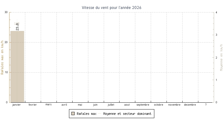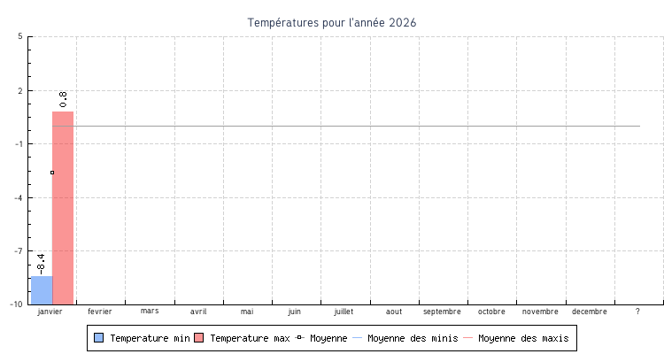 | janvier | -8.4 °C | -5.4 °C | 0.8 °C | 0.3 °C | -2.6 °C | 3.7 km/h | 23.8 km/h | 185 |